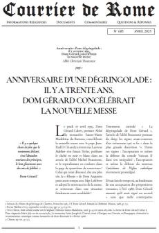 Le Courrier de Rome a vu le jour en janvier 1967, au lendemain du concile Vatican II. Ses fondateurs avaient pour ambition non de rassembler mais d’unir les catholiques autour de la doctrine de l’Eglise qui était de plus en plus, et de toutes parts, sapée, attaquée, ruinée par les doctrines progressistes. Pour arriver à cette fin, il a fallu « diviser », c’est-à-dire faire « œuvre d’épuration doctrinale et d’élucidation », pour mettre en évidence l’enseignement constant de l’Eglise et le séparer de tout ce qui ne l’est pas et qui est malheureusement enseigné officiellement par un grand nombre d’hommes d’Eglise, et cela à tous les niveaux de la hiérarchie. Comme la révolution conciliaire a touché non seulement toutes les vérités de la foi, mais aussi tous les domaines de la morale, le Courrier de Rome offre à ses lecteurs les réfutations des principales erreurs actuelles et leur montre le chemin et la lumière de la vérité.