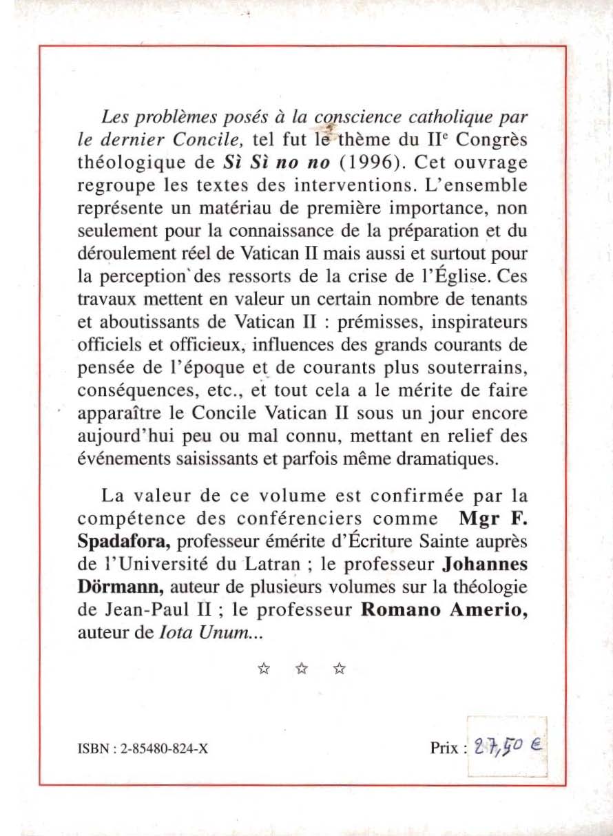 Église et Contre-Église au concile Vatican II 0 Aucun vote pour le moment Dates congrès: 2 et 5 janvier 1996Nombre de pages: 482 p. (épuisé) 27,00 € Price 25,60 € Google Plus Un Like Facebook Tweet Widget Ceci vous intéressera sûrement L'Église d'aujourd'hui : continuité ou rupture ? Principes catholiques pour rester fidèle à l'Église en ces temps extraordinaires de crise Les crises dans l'Église, les causes, effets et remèdes La tentation de l'oecuménisme