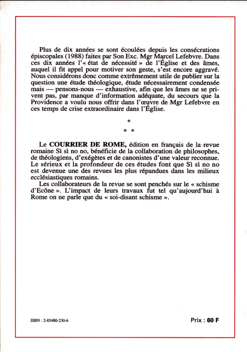 Ce volume réunit divers articles du « Courrier de Rome» au sujet des consécrations épiscopales du 30 juin 1988.