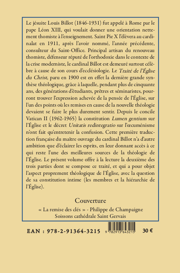 Le jésuite Louis Billot (1846-1931) fut appelé à Rome par le pape Léon XIII, qui voulait donner une orientation nettement thomiste à l’enseignement. Saint Pie X l’élèvera au cardinalat en 1911, après l’avoir nommé, l’année précédente, consulteur du Saint-Office. Principal artisan du renouveau thomiste, défenseur réputé de l’orthodoxie dans le contexte de la crise moderniste, le cardinal Billot est demeuré surtout célèbre à cause de son cours d’ecclésiologie. Le Traité de l’Église du Christ, paru en 1900 est en effet la dernière grande synthèse théologique, grâce à laquelle, pendant plus de cinquante ans, des générations d’étudiants, prêtres et séminaristes, pourront trouver l’expression achevée de la pensée de l’Église, sur l’un des points où les remises en cause de la nouvelle théologie devaient se faire le plus durement sentir. Depuis le concile Vatican II (1962-1965) la constitution Lumen gentium sur l’Église et le décret Unitatis redintegratio sur l’œcuménisme n’ont fait qu’entretenir la confusion. Cette première traduction française du maître ouvrage du cardinal Billot n’a d’autre ambition que d’éclairer les esprits, en leur donnant accès à ce qui reste l’une des meilleures sources de la théologie de l’Église.