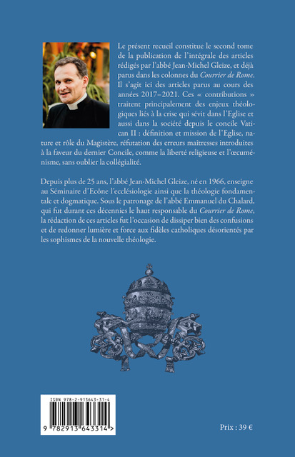 Depuis plus de 25 ans, l’abbé Jean-Michel Gleize, né en 1966, enseigne au Séminaire d’Écône l’ecclésiologie ainsi que la théologie fondamentale et dogmatique. Sous le patronage de l’abbé Emmanuel du Chalard, qui fut durant ces décennies le haut responsable du Courrier de Rome, la rédaction de ces articles fut l’occasion de dispenser des contributions et de redonner lumière et force aux fidèles catholiques désorientés par les sophismes de la nouvelle théologie.